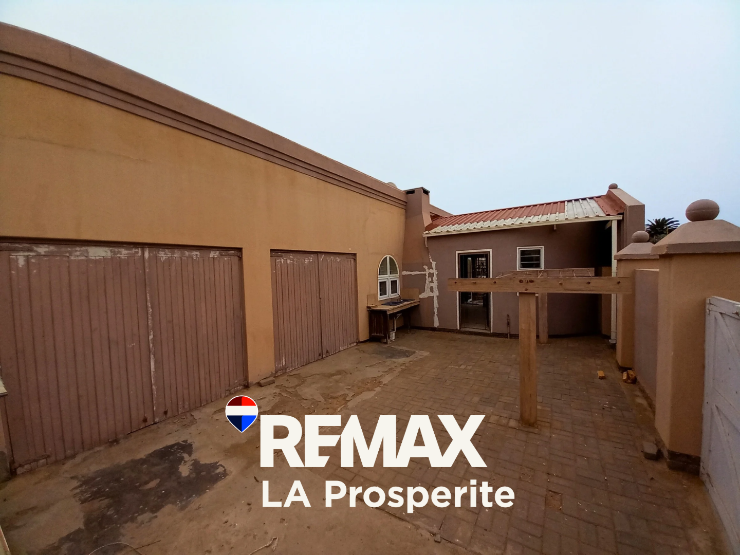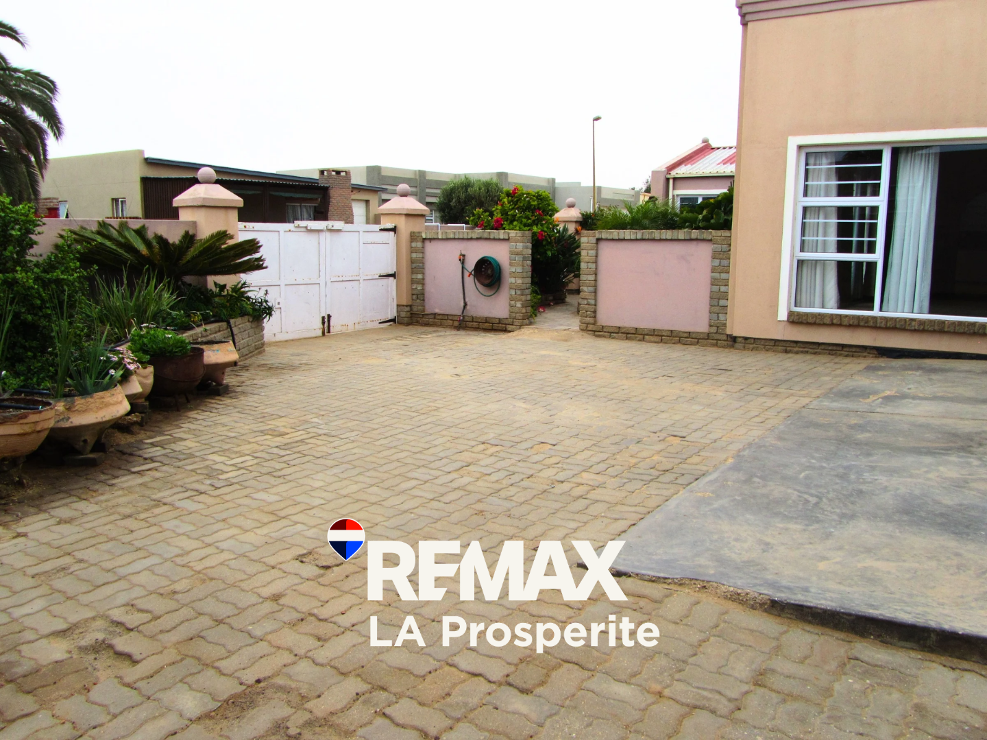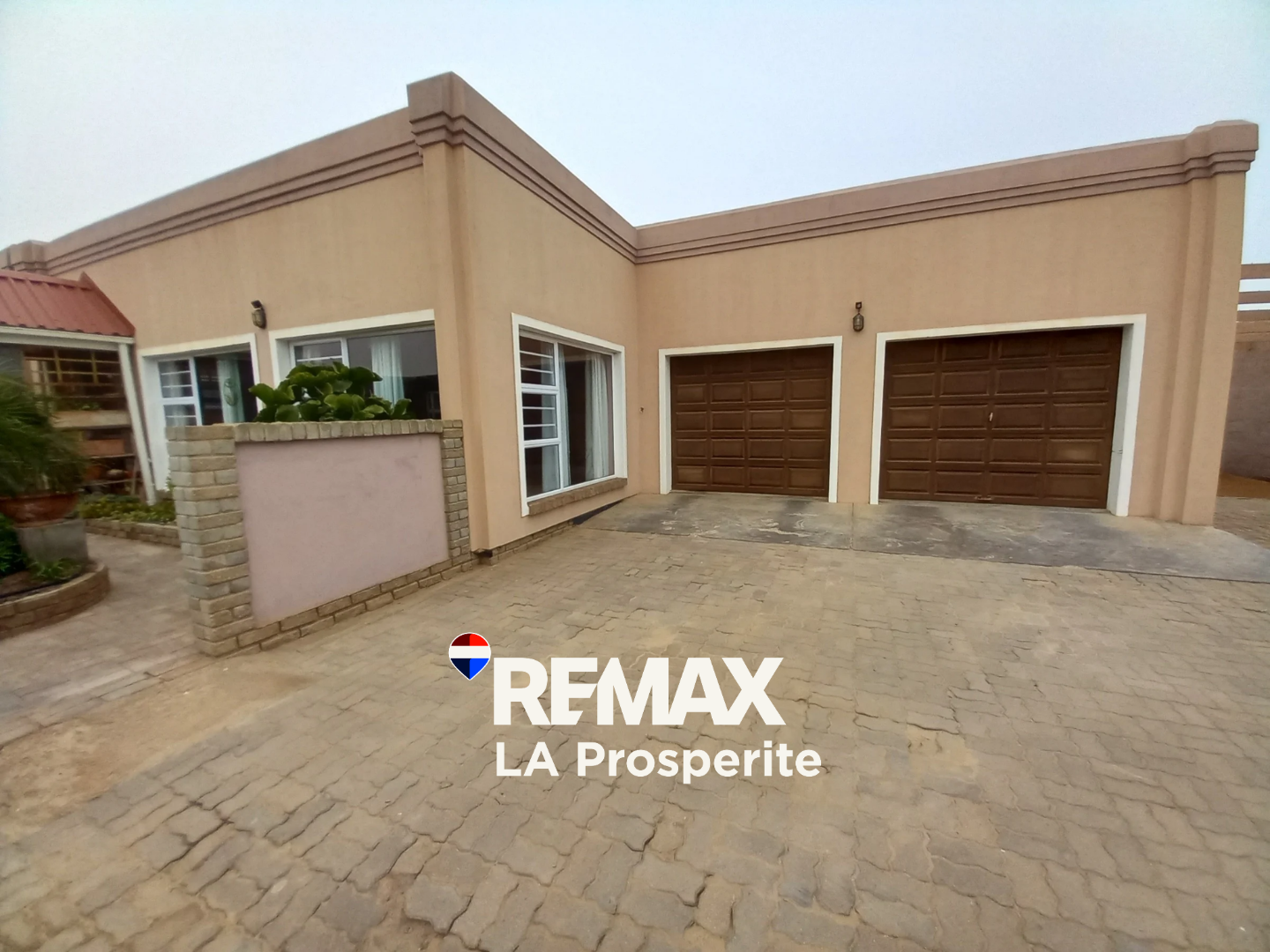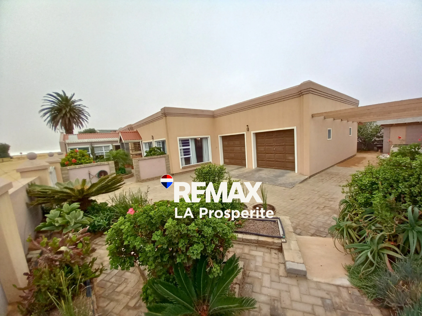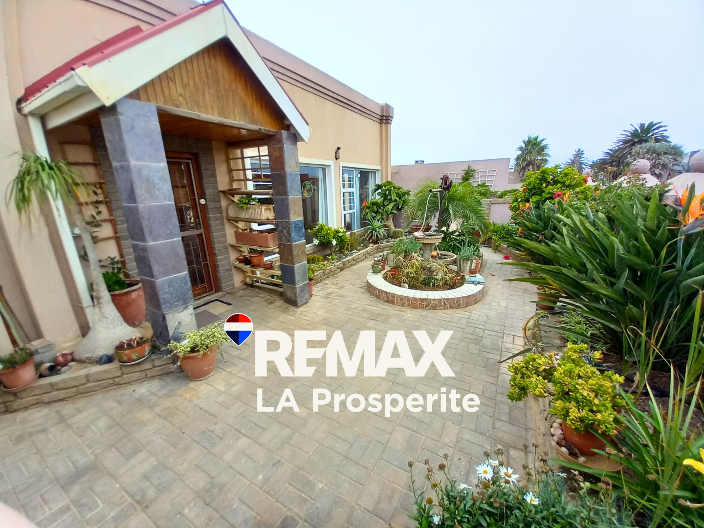 Discover this expansive 4-bedroom, 3-bathroom residence nestled in the suburban charm of Henties Bay, Namibia. This impressive property, spanning 385 sqm on an 876 sqm erf, immediately captivates with its well-maintained exterior, lush mature gardens, and inviting paved pathways leading to a covered entrance adorned with decorative stone pillars. The home offers a welcoming first impression, blending architectural character with natural beauty.
