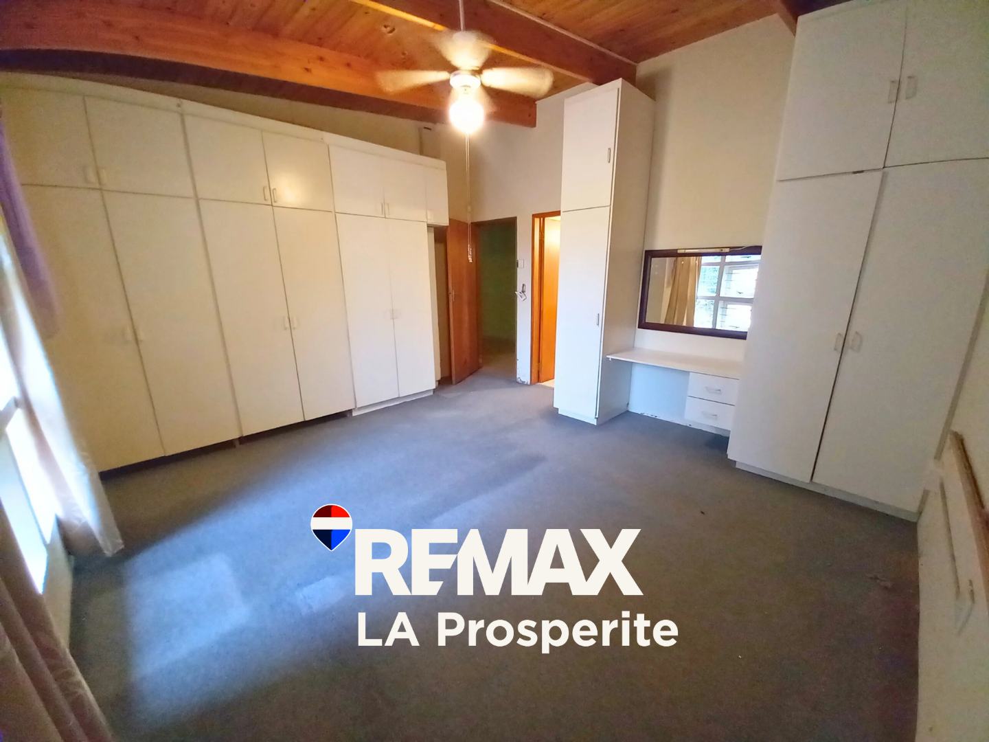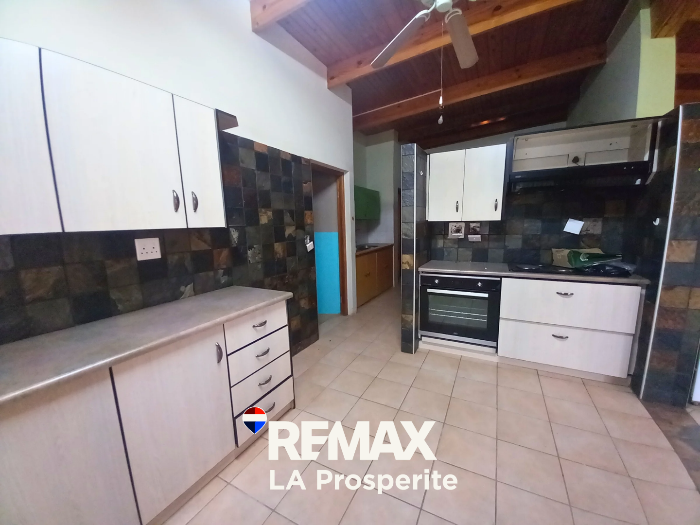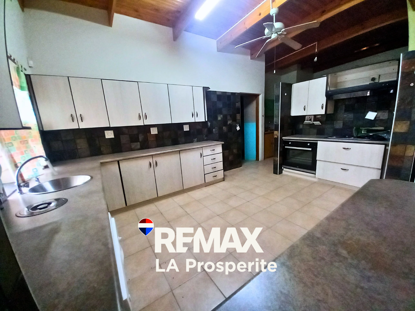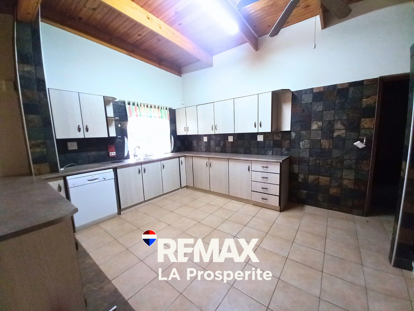 Step inside to an intelligently designed interior featuring two spacious lounges and a dedicated dining room, all boasting durable tiled flooring and striking vaulted wooden ceilings with exposed beams and ceiling fans, creating an airy and comfortable atmosphere. The open-plan layout seamlessly connects living areas, including a well-appointed kitchen with modern white cabinetry, ample counter space, a pantry, and an integrated dishwasher. A built-in bar and a cozy fireplace enhance the entertainment potential, while a guest toilet adds convenience.