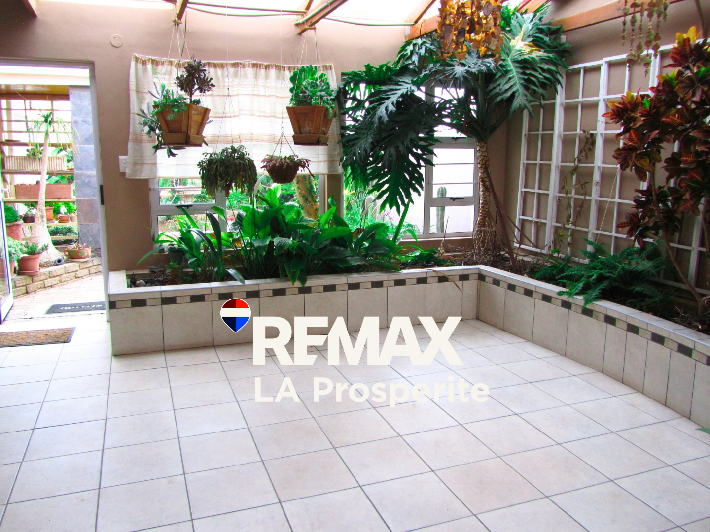 A unique highlight is the bright, spacious sunroom or semi-enclosed patio, which integrates a vibrant, lush indoor garden with diverse plants set in built-in tiled planters. This area also features a built-in braai, skylights, and a unique shell chandelier, offering a perfect year-round connection to nature and an ideal space for entertaining. The home provides four comfortable bedrooms, including one en-suite bathroom, ensuring ample private accommodation for residents.