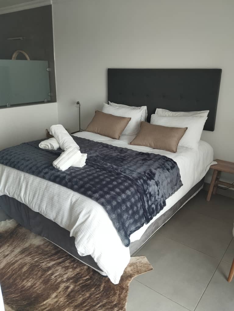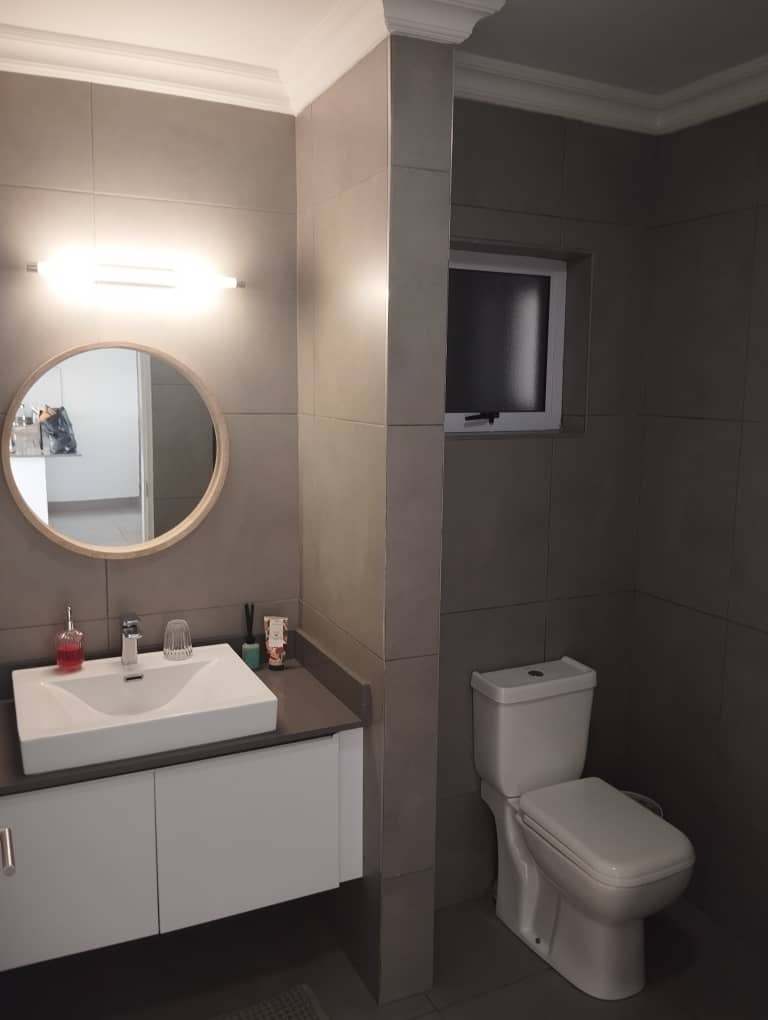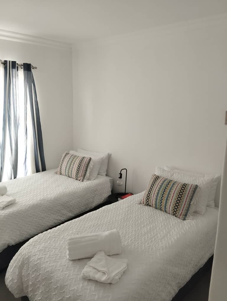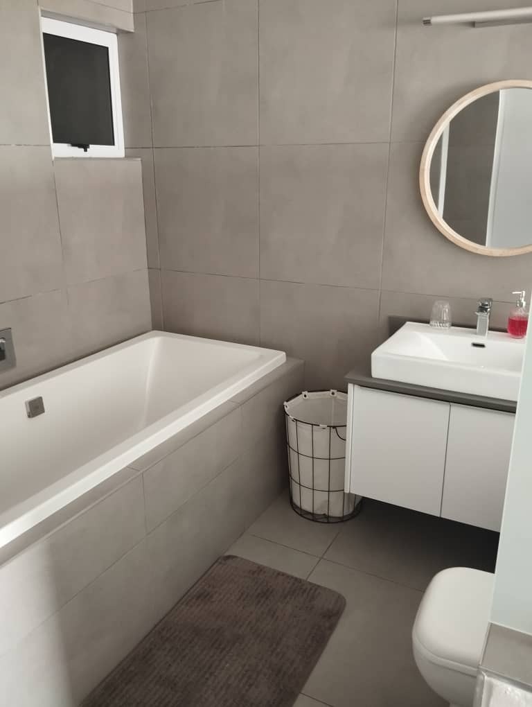 The residence offers two comfortable bedrooms and two well-appointed bathrooms. The main bedroom provides a clean, modern aesthetic with a dark upholstered headboard and a neutral colour palette, creating a serene retreat. The second bedroom is bright and tidy, featuring two single beds with crisp white bedding. Both bathrooms are finished with large grey tiles and modern fixtures; one includes a wall-mounted vanity with a vessel sink and a private toilet alcove, while the other features a built-in bathtub, floating vanity, and a dedicated shower area with a mosaic floor.