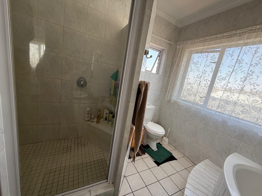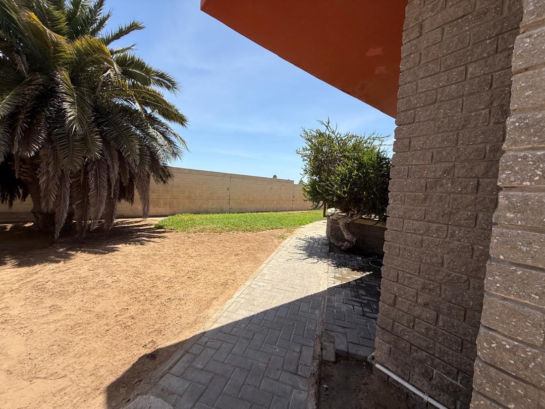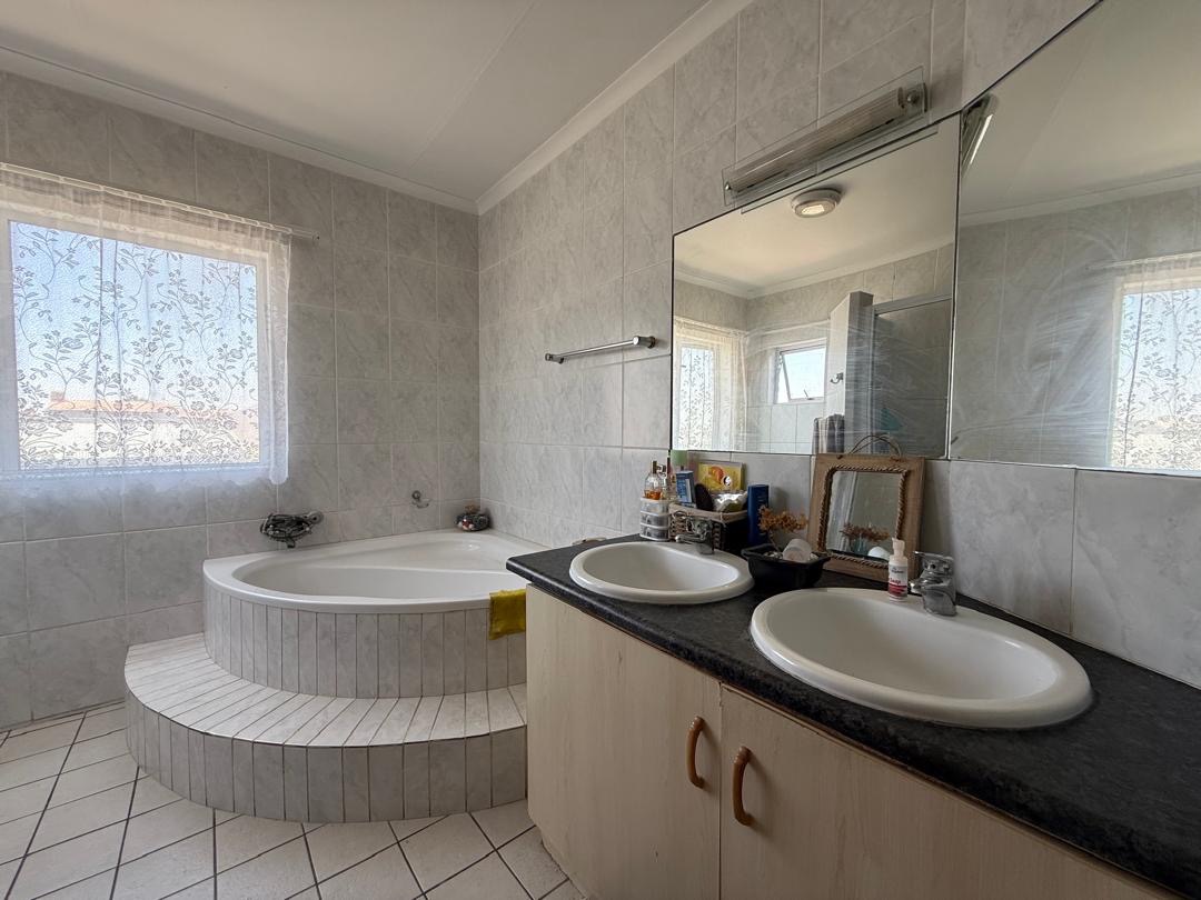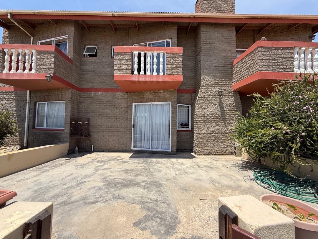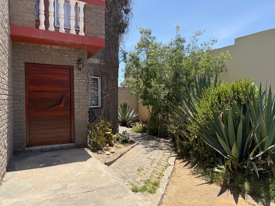 Outdoor living is well-catered for with a private garden and paved sections, ideal for outdoor activities or enjoying the Namibian climate. A notable feature is the balconies, offering an elevated space for relaxation. The property also includes a double garage, providing secure parking and additional storage.