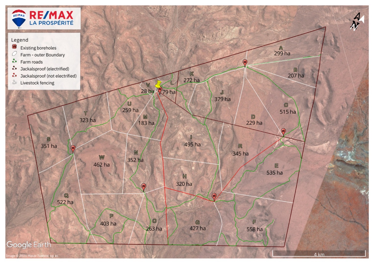 This established farm offers endless opportunities with a waiver in place. It features four jackal-proof blocks with wire mesh electrified at the bottom, twenty-three camps with full jackal-proof fencing, and six kilometers of wild game-proof fence. There are eight boreholes, seven with windmills and one with a submersible pump. All livestock posts have five drinking troughs, each with a dam or a tank, and all livestock maintenance areas include sorting kraals. Non-perennial rivers run through the property, flanked by abundant trees along the banks. The buyer will have the first option to purchase vehicles, implements, farm tools, etc., which are sold separately.