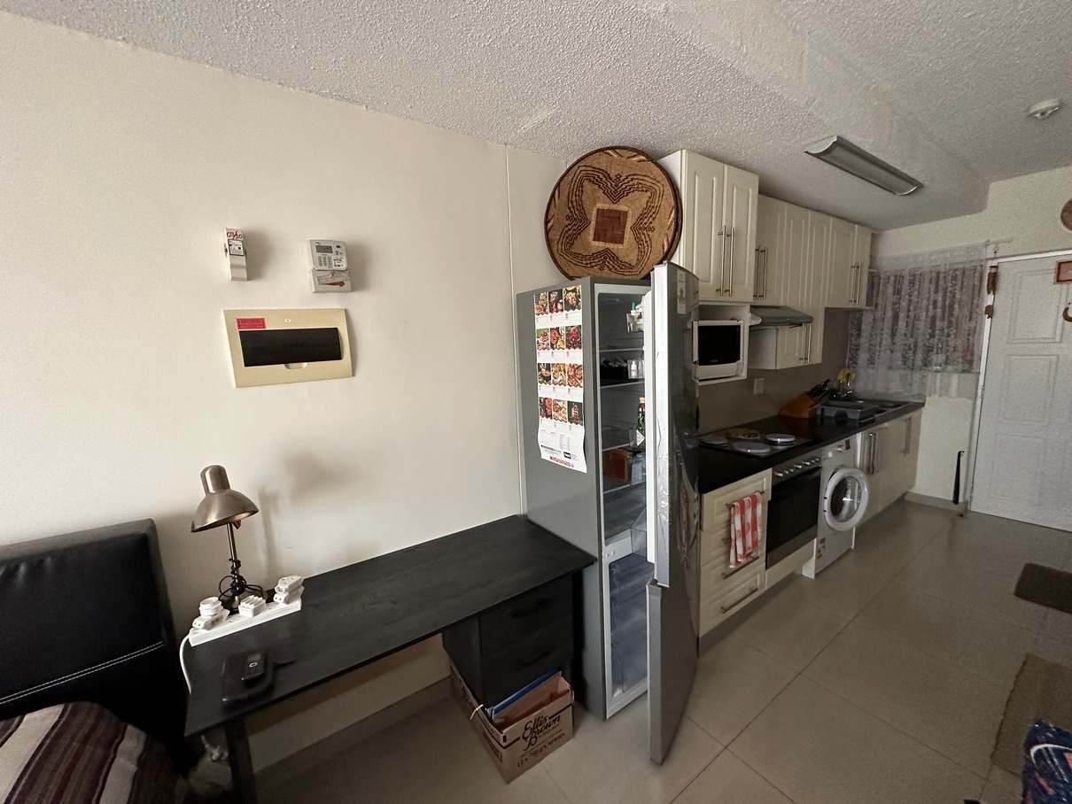 - Kitchen area has a space for a fridge and washing machine
