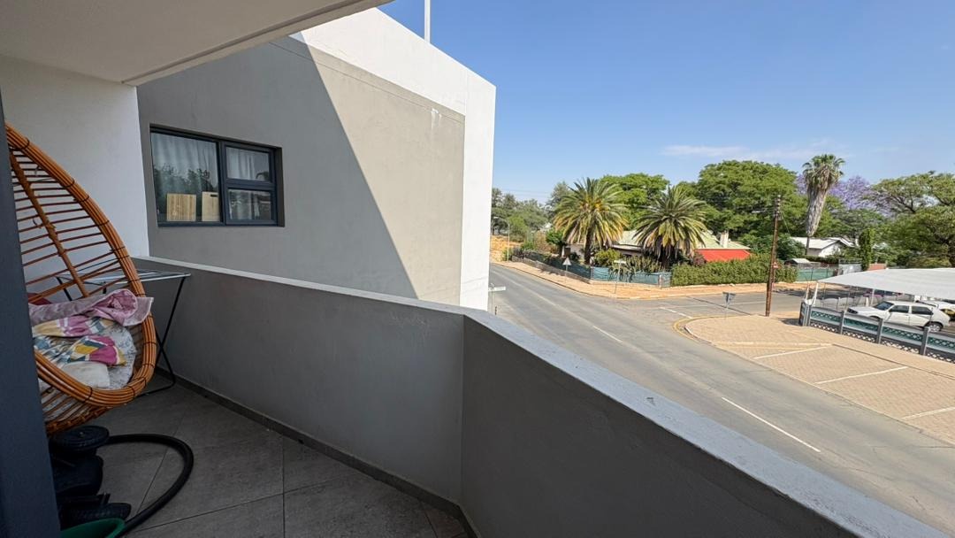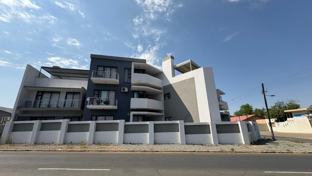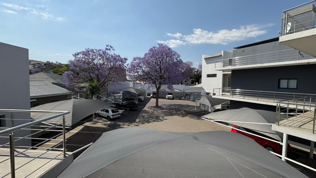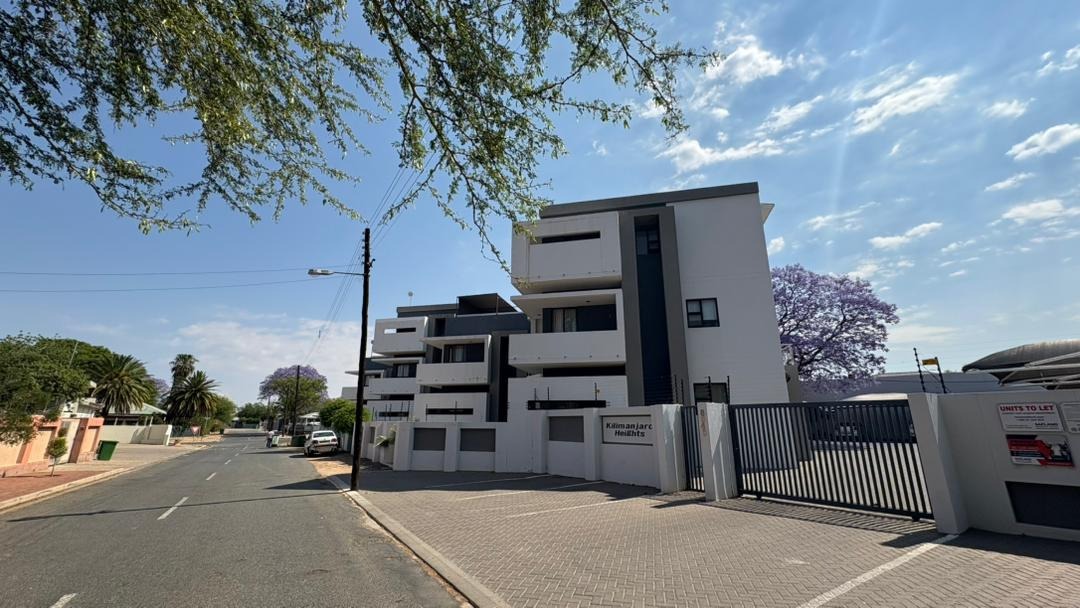 Presenting a sophisticated residential opportunity within the esteemed Kilimanjaro Heights complex, situated in the desirable Eros suburb of Windhoek, Namibia. This contemporary apartment building showcases a modern architectural design, distinguished by its clean lines and a refined palette of white and dark grey. The property's kerb appeal is enhanced by a secure, gated entrance, complemented by electric fencing and a dedicated security post, ensuring a tranquil living environment for residents. A well-maintained paved parking area, featuring ample covered bays, is thoughtfully integrated, alongside the natural beauty of blooming Jacaranda trees that add a vibrant aesthetic to the exterior.