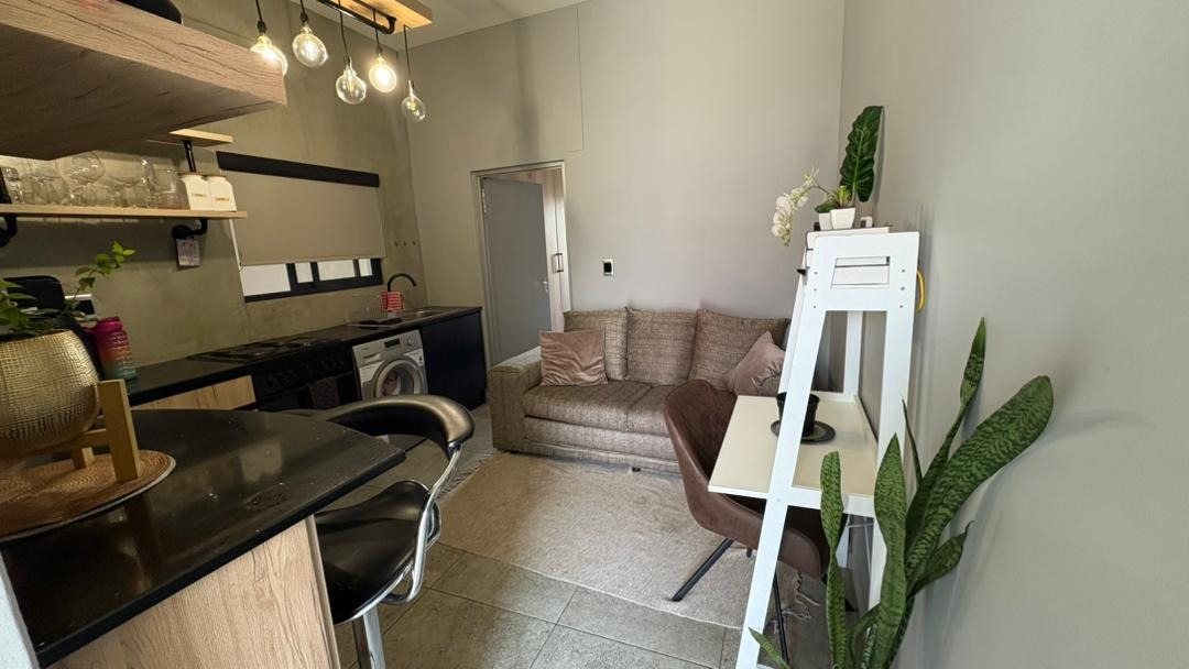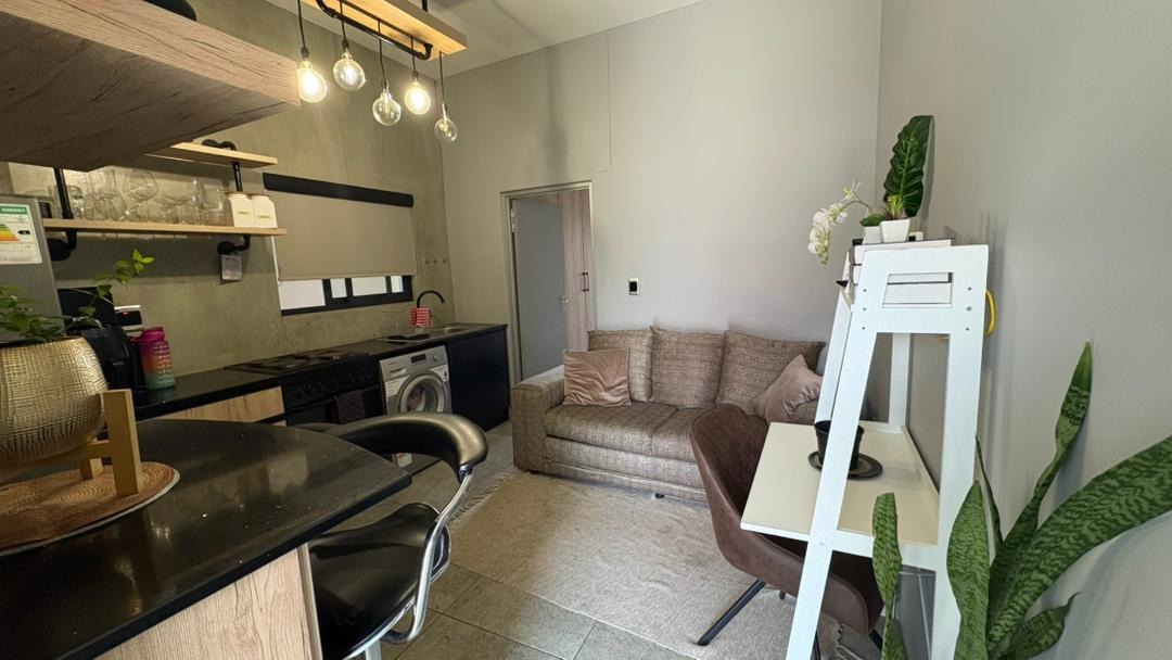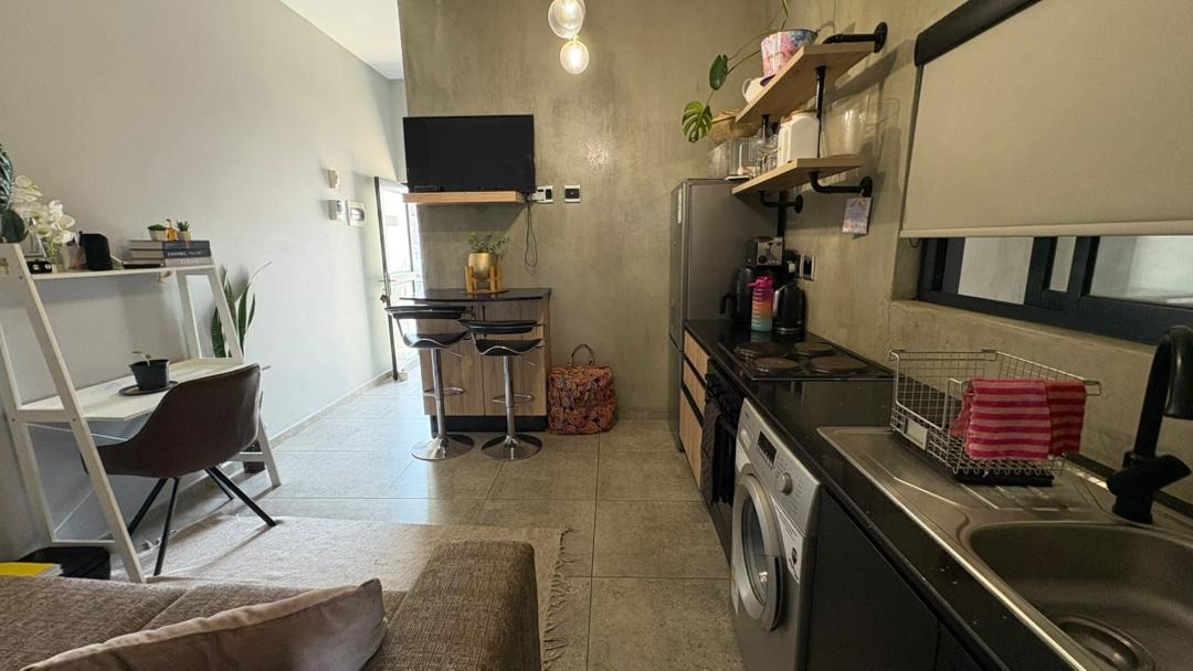 This meticulously designed apartment features one well-appointed bedroom and a single modern bathroom, providing a comfortable and private retreat. The interior boasts a functional layout, comprising a dedicated lounge area and a fully equipped kitchen, ideal for contemporary living. The inclusion of a private balcony, accessible via sliding doors, extends the bedroom space outdoors, offering a personal area for relaxation. The internal common areas, such as stairwells, exhibit a modern aesthetic with durable tiled steps, sturdy metal handrails, and recessed ceiling lighting, reflecting a commitment to quality and design.