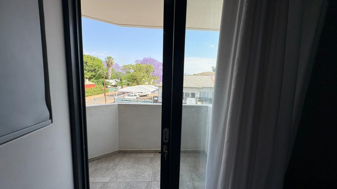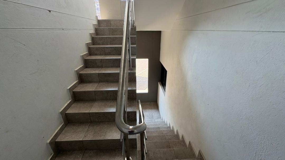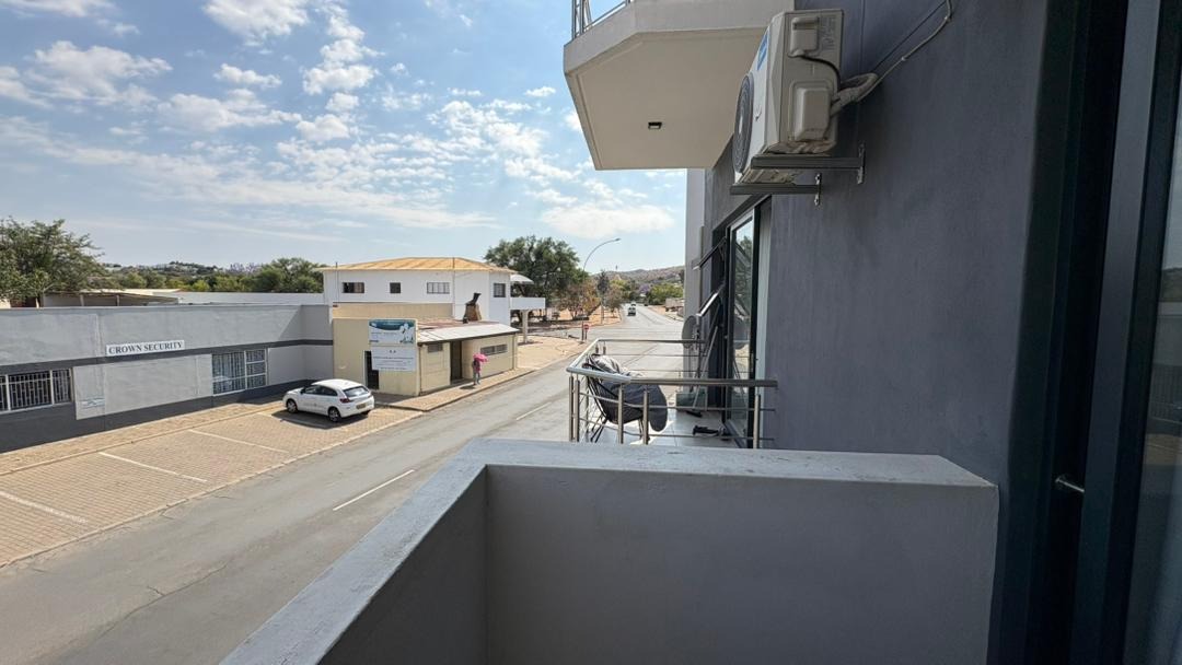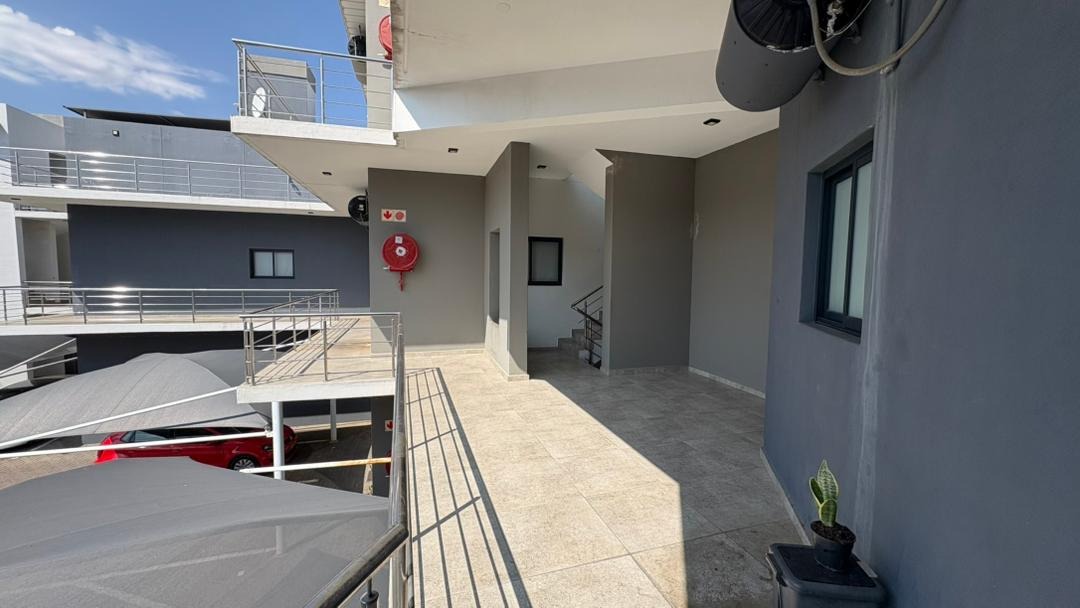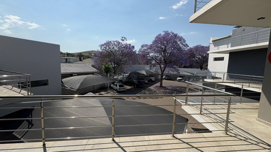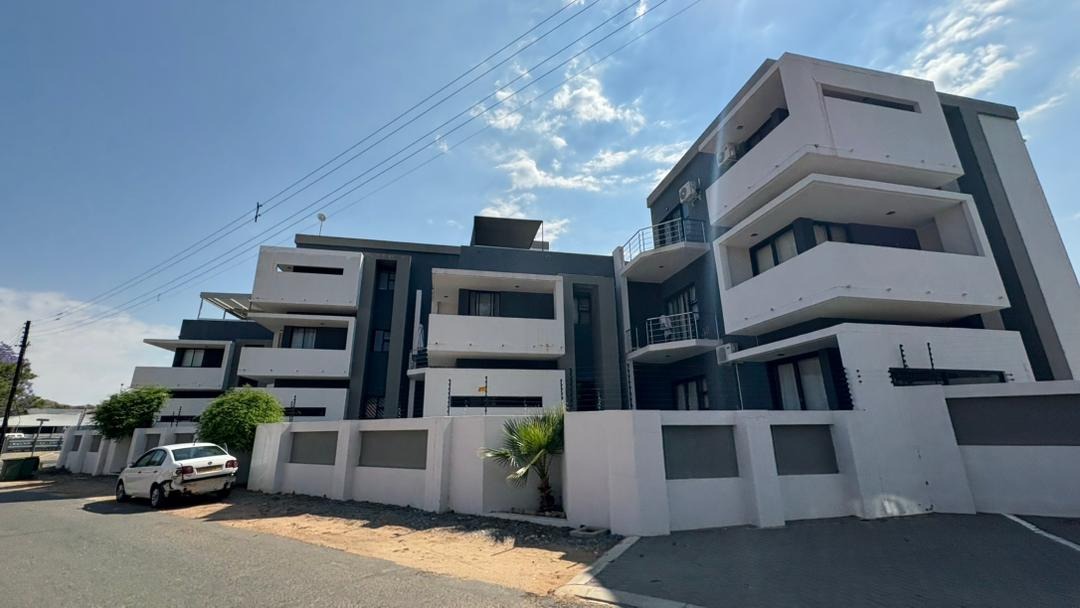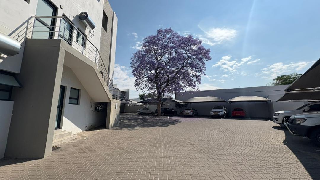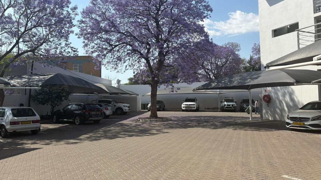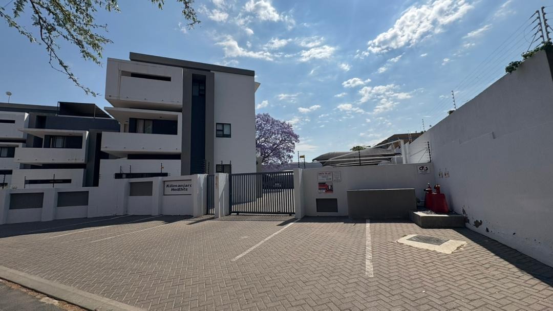Presenting a sophisticated residential opportunity within the esteemed Kilimanjaro Heights complex, situated in the desirable Eros suburb of Windhoek, Namibia. This contemporary apartment building showcases a modern architectural design, distinguished by its clean lines and a refined palette of white and dark grey. The property's kerb appeal is enhanced by a secure, gated entrance, complemented by electric fencing and a dedicated security post, ensuring a tranquil living environment for residents. A well-maintained paved parking area, featuring ample covered bays, is thoughtfully integrated, alongside the natural beauty of blooming Jacaranda trees that add a vibrant aesthetic to the exterior.