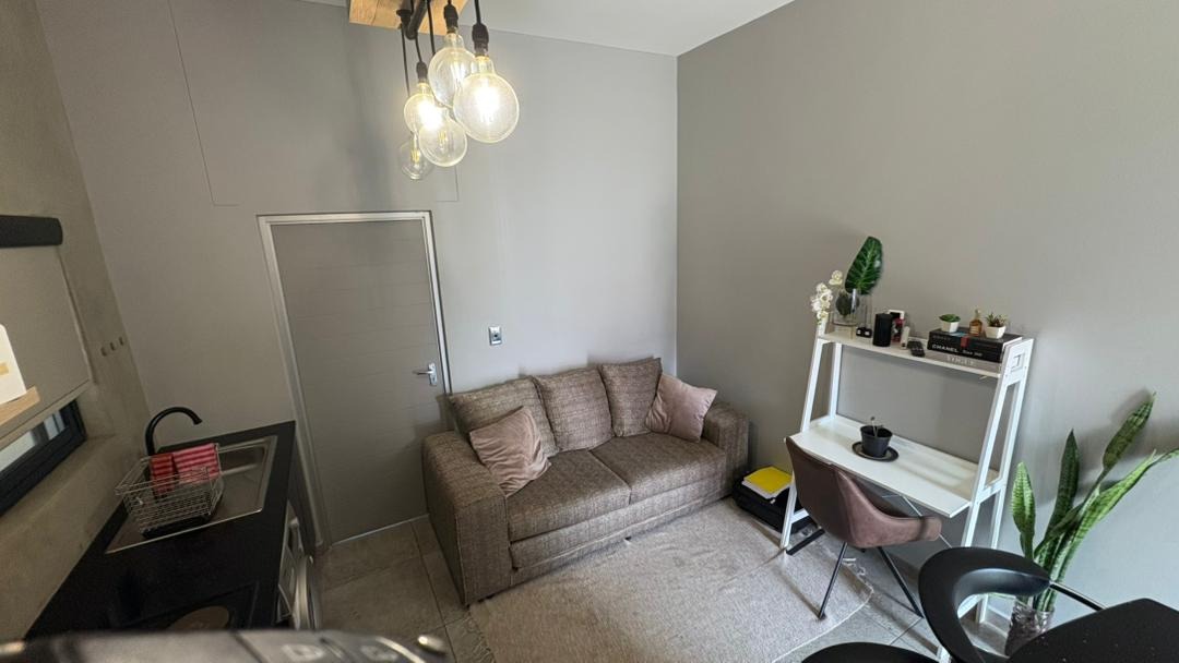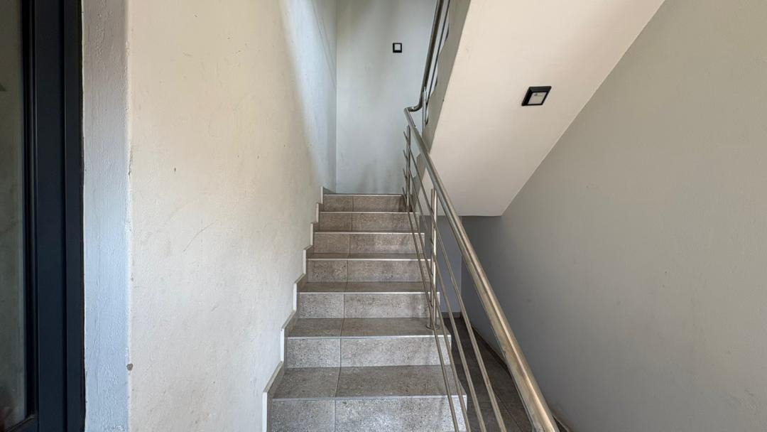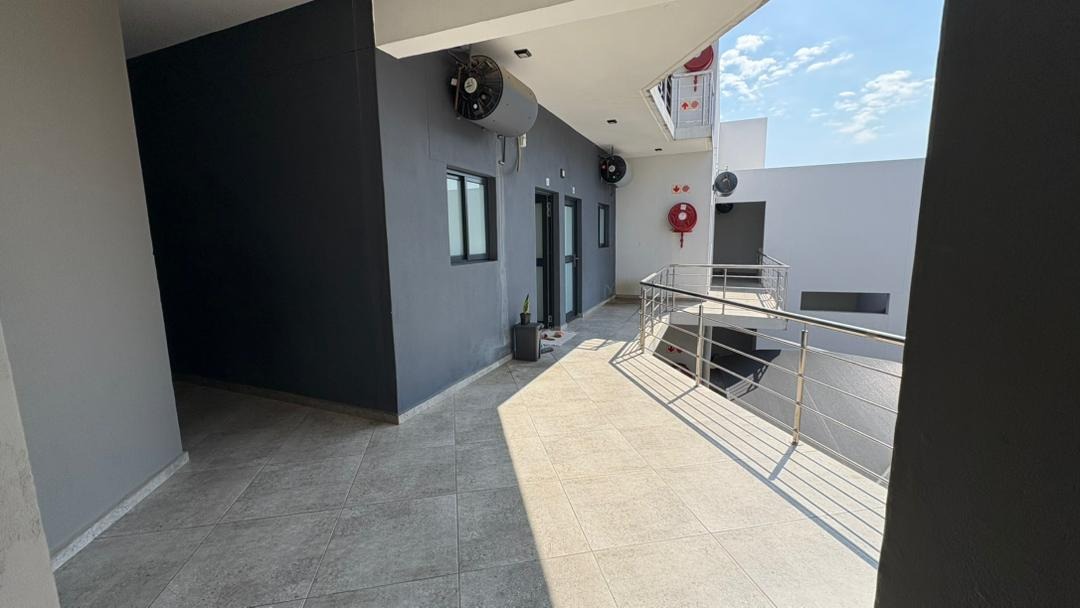 This meticulously designed apartment features one well-appointed bedroom and a single modern bathroom, providing a comfortable and private retreat. The interior boasts a functional layout, comprising a dedicated lounge area and a fully equipped kitchen, ideal for contemporary living. The inclusion of a private balcony, accessible via sliding doors, extends the bedroom space outdoors, offering a personal area for relaxation. The internal common areas, such as stairwells, exhibit a modern aesthetic with durable tiled steps, sturdy metal handrails, and recessed ceiling lighting, reflecting a commitment to quality and design.