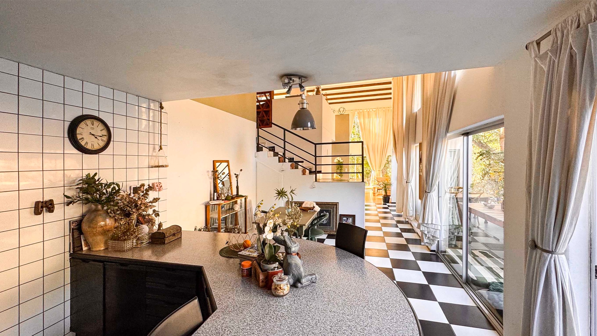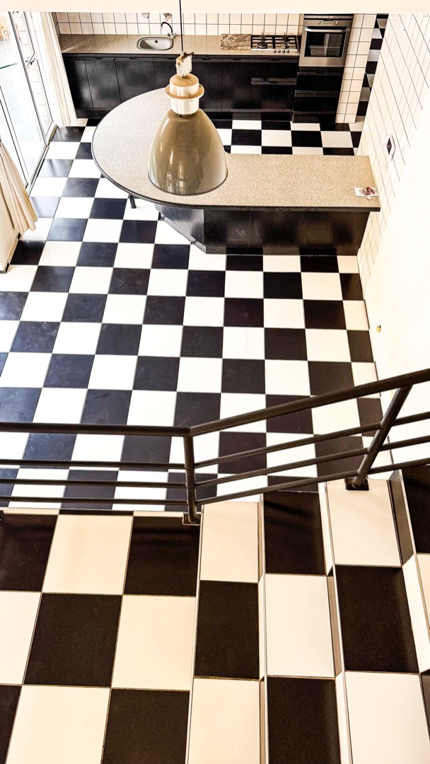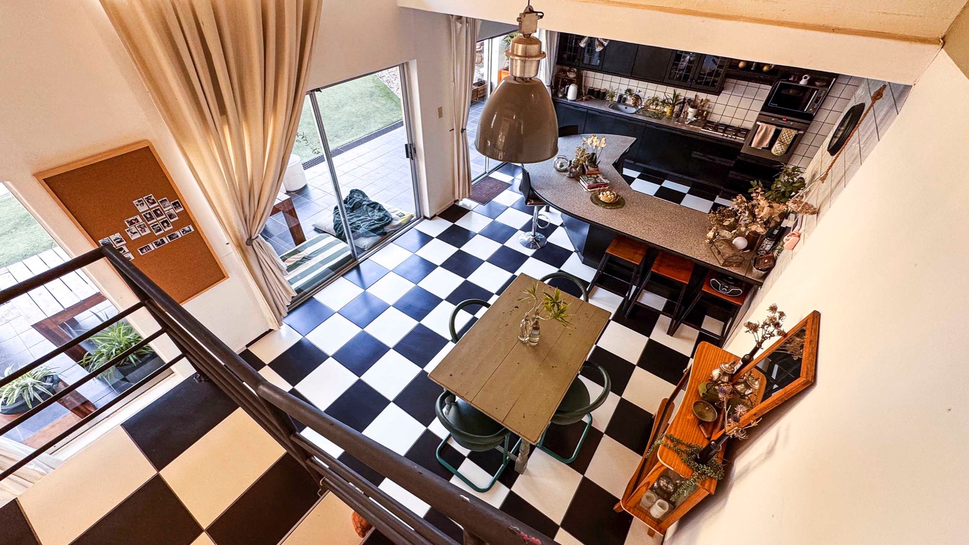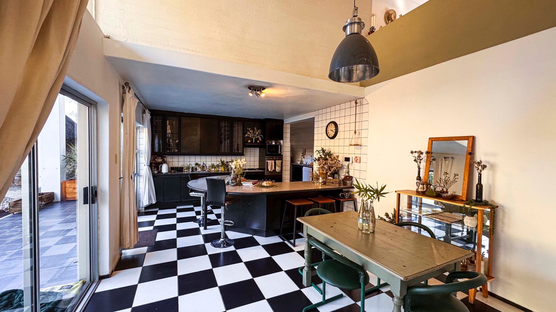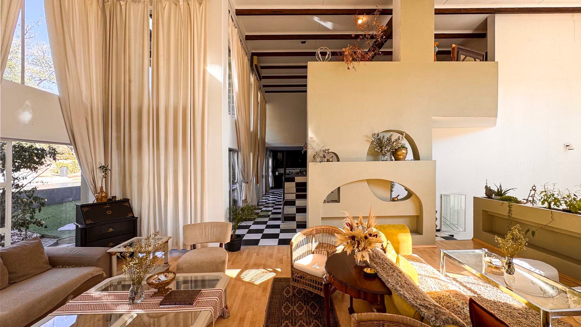 Step inside and feel the warm, rustic charm of the double-volume ceiling with its exposed wooden beams, a striking feature that elevates the home's unique character. Below, elegant black-and-white check tiles flow seamlessly through the living spaces, creating a timeless and sophisticated feel.