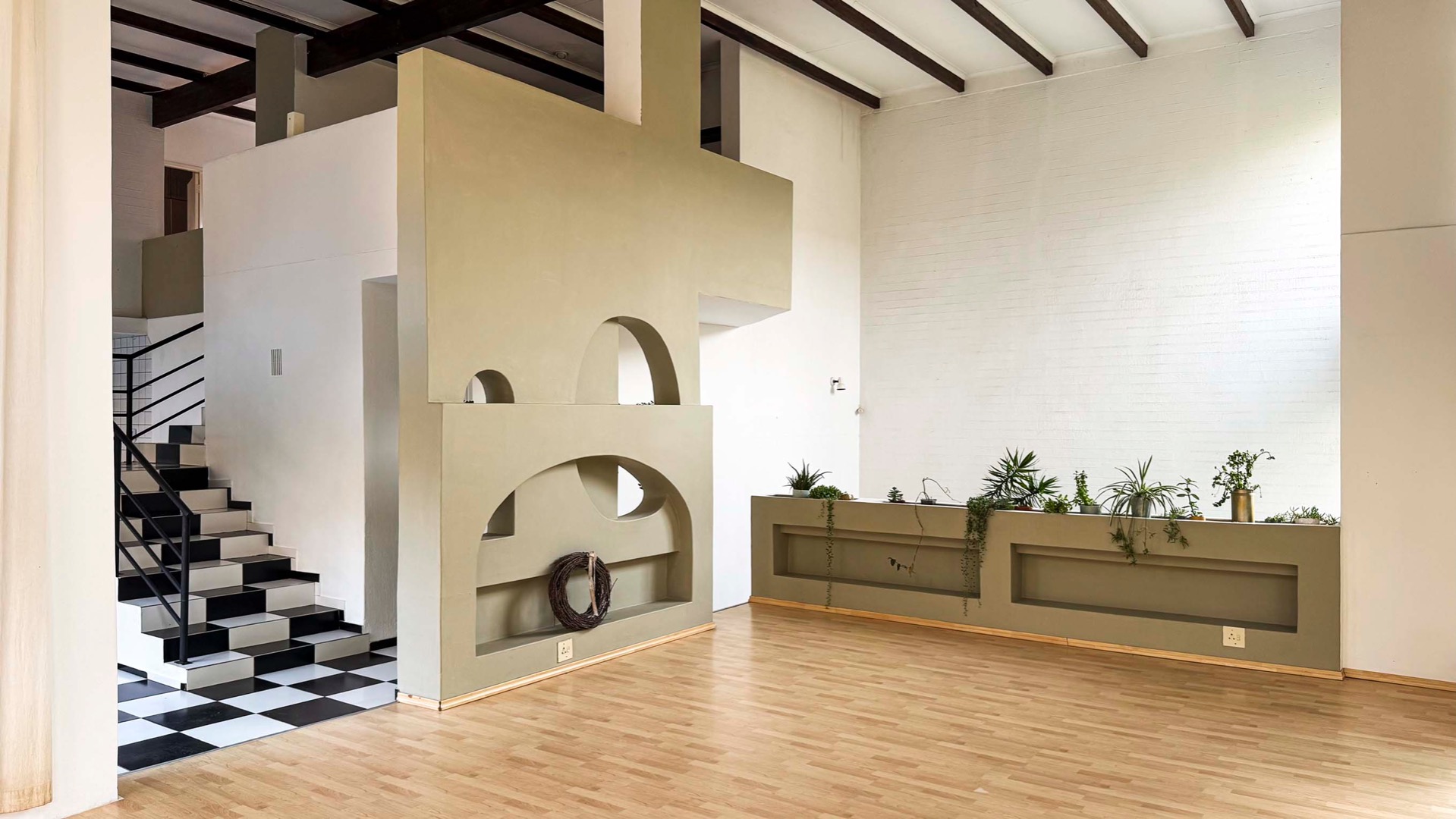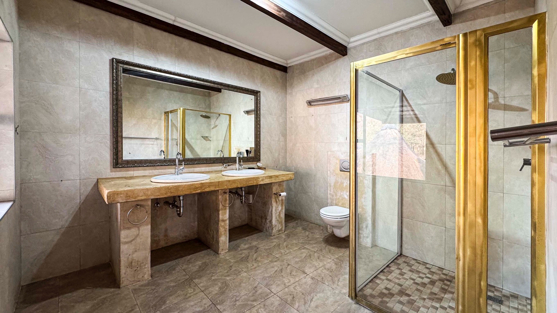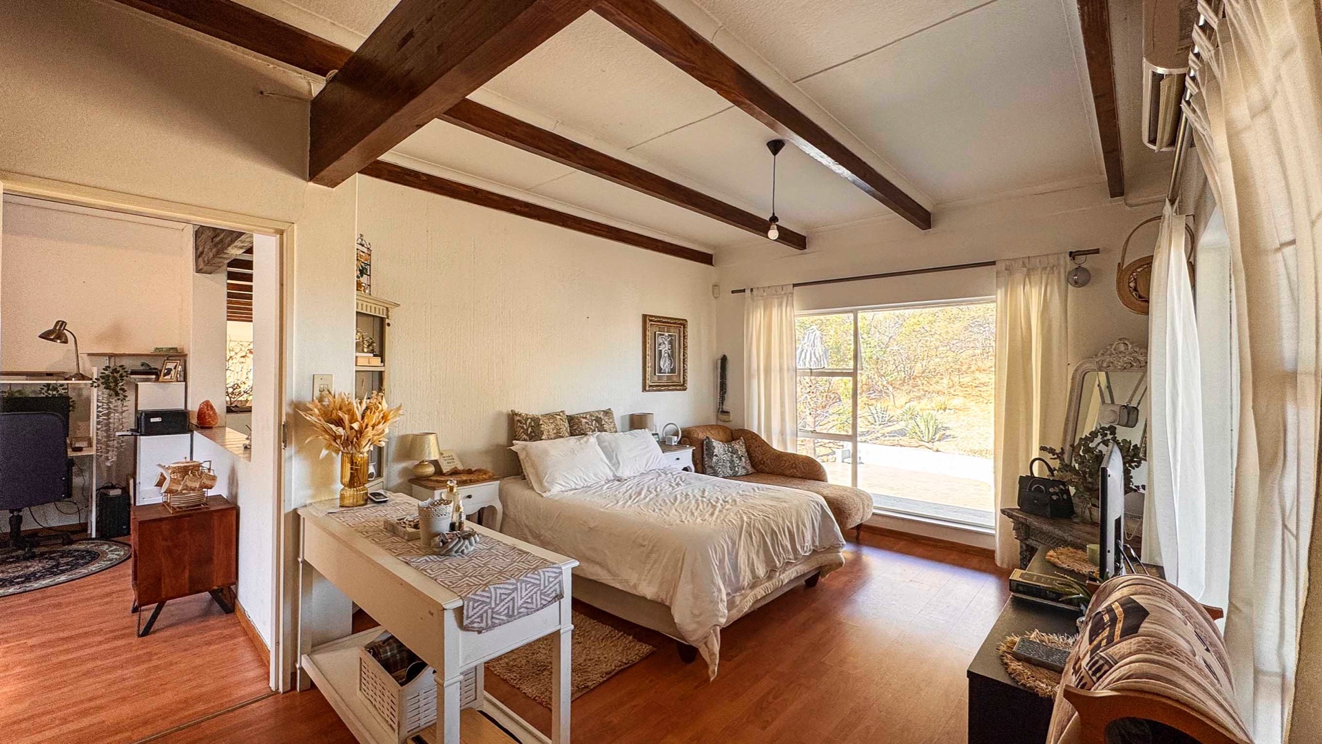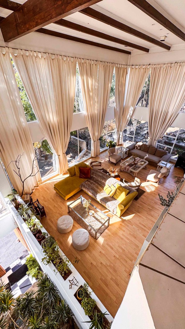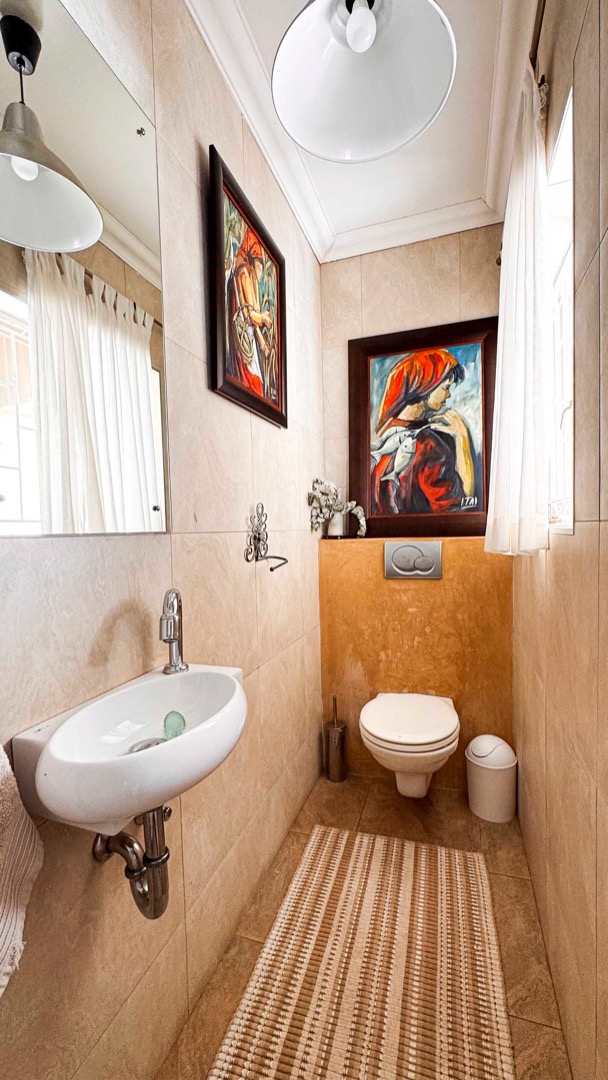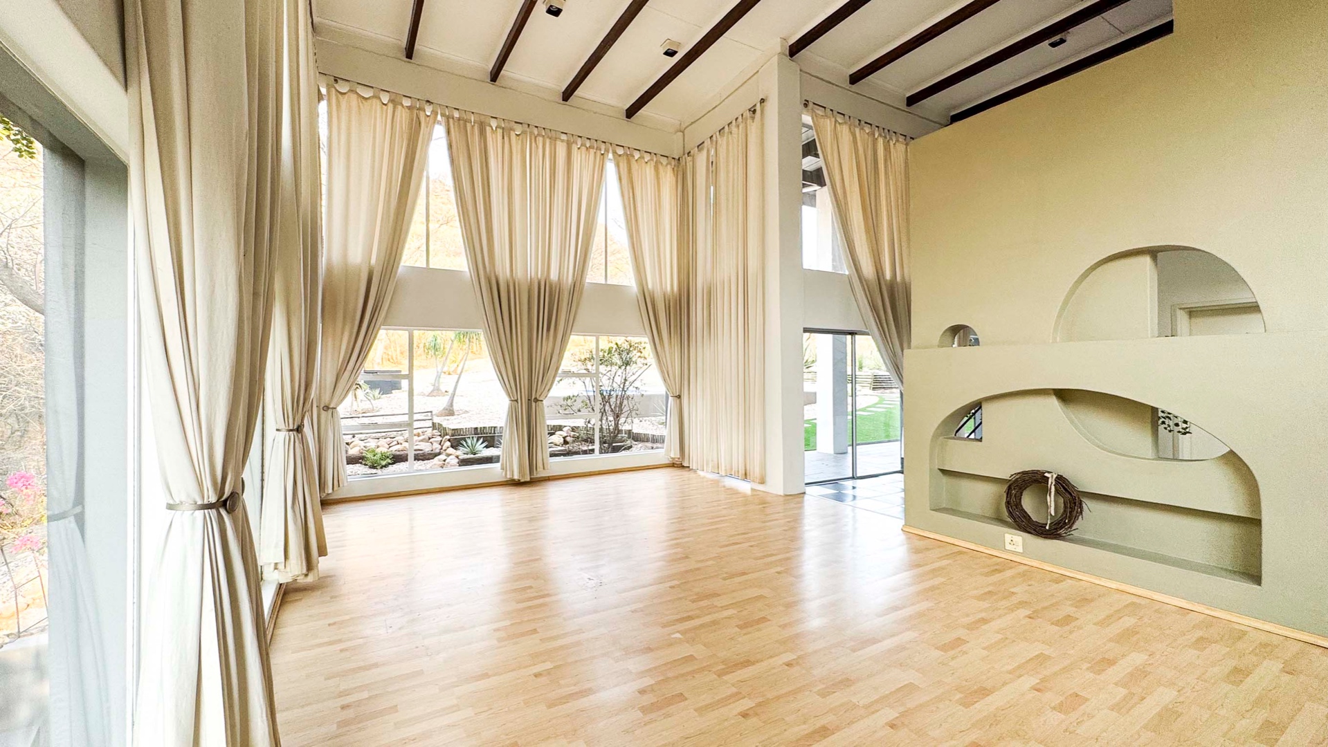 Step inside and feel the warm, rustic charm of the double-volume ceiling with its exposed wooden beams, a striking feature that elevates the home's unique character. Below, elegant black-and-white check tiles flow seamlessly through the living spaces, creating a timeless and sophisticated feel.