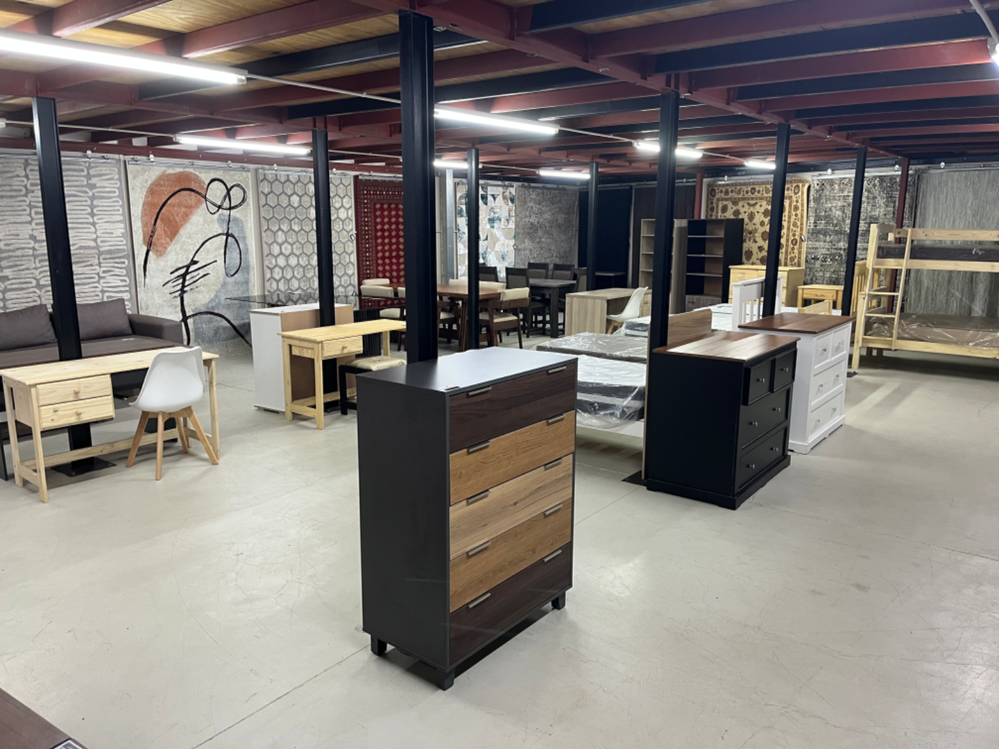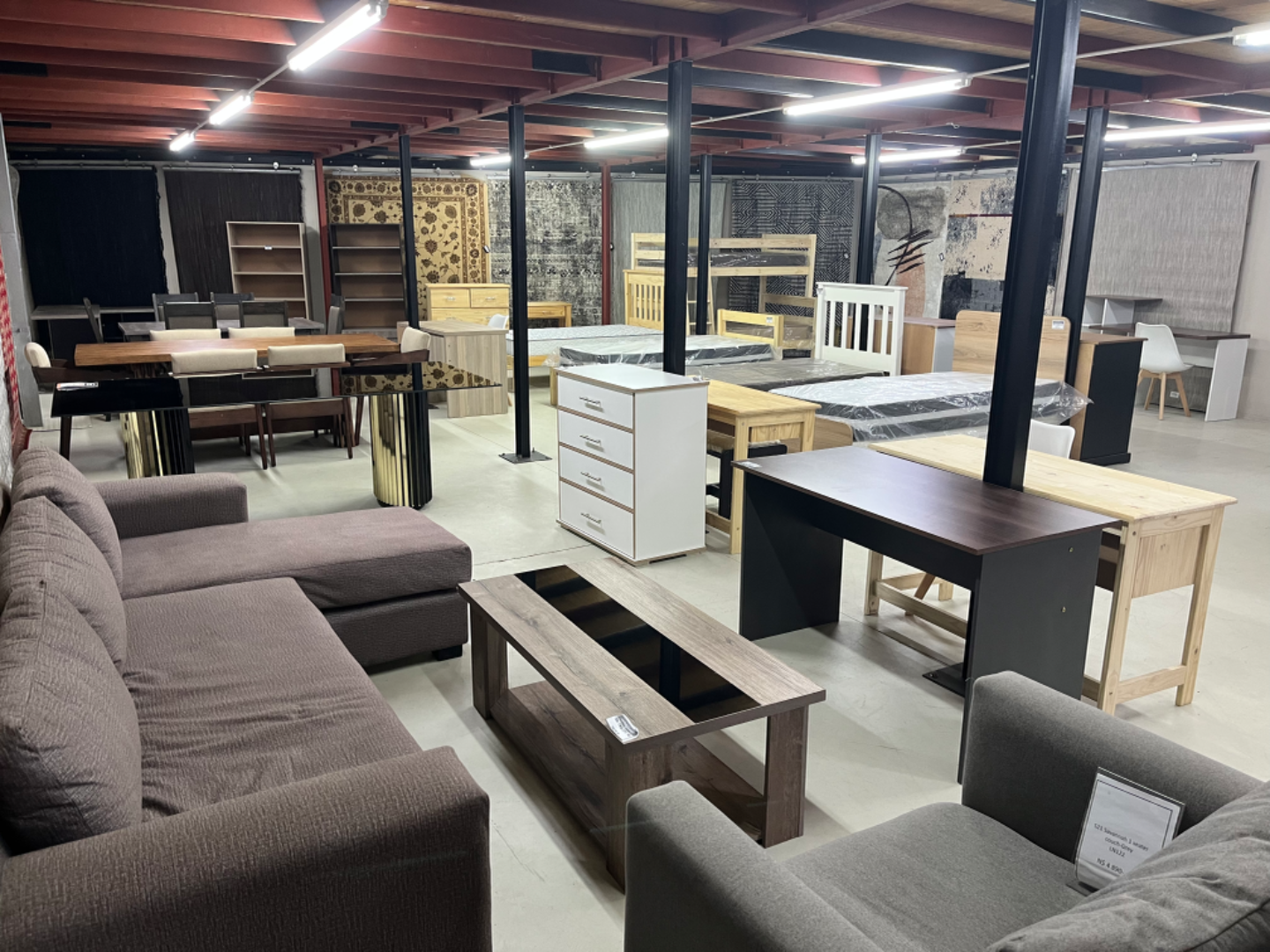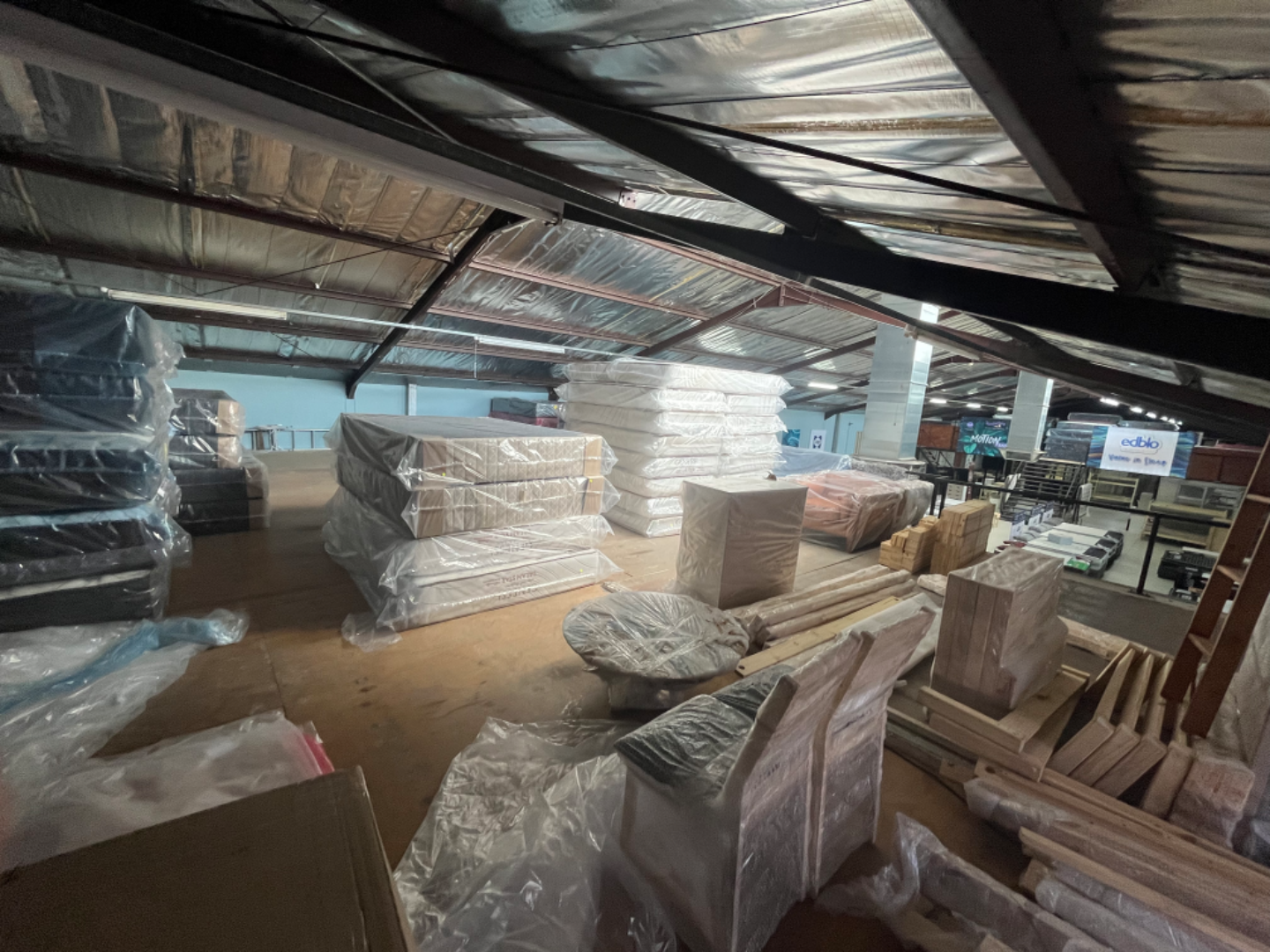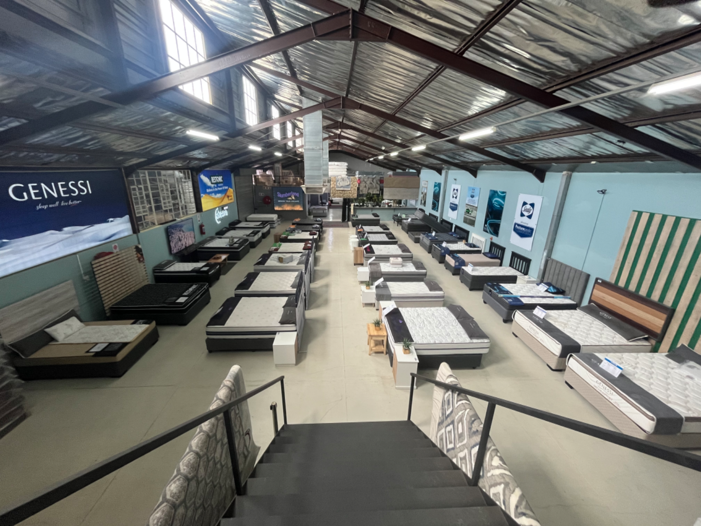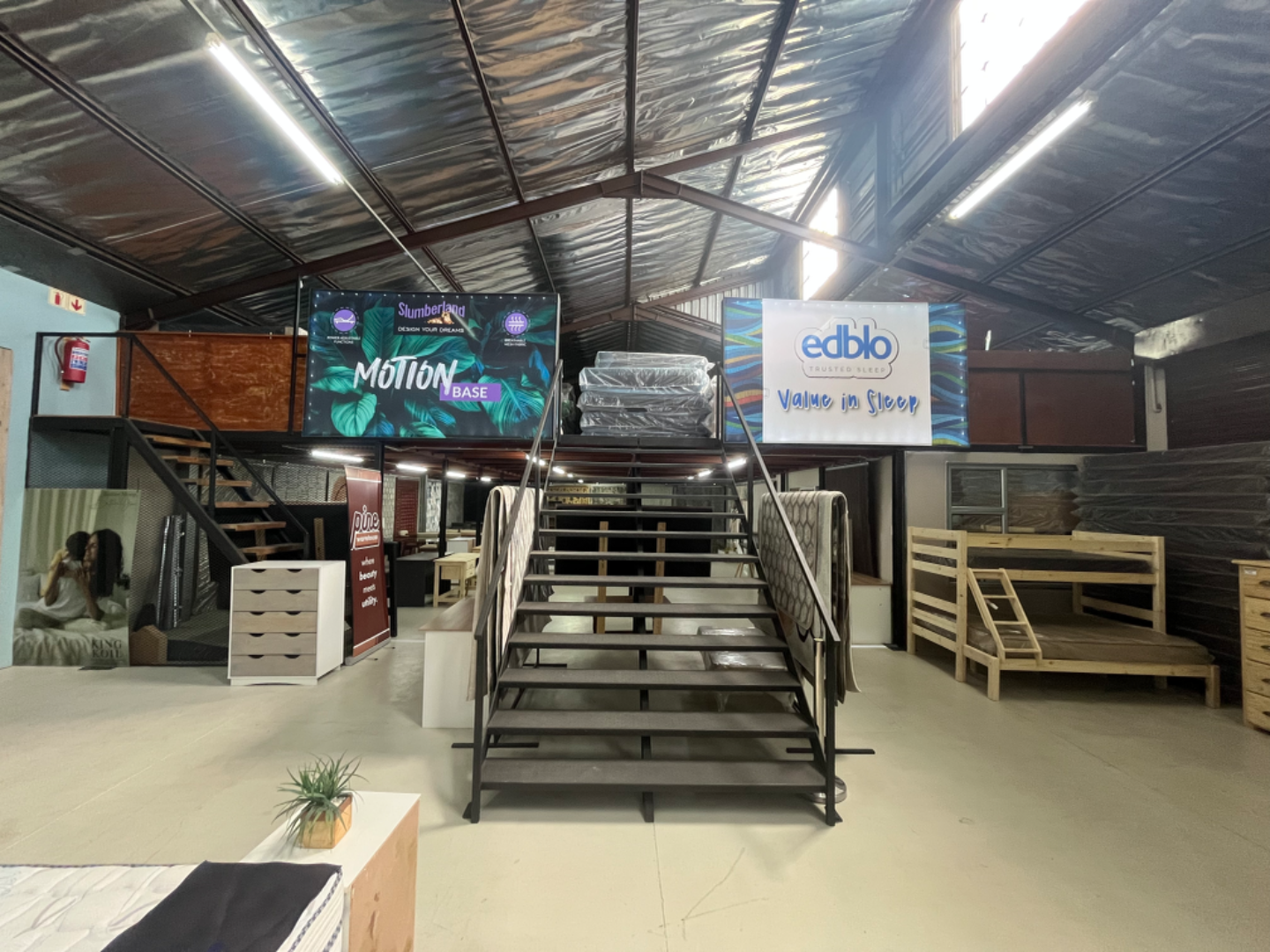 The interior boasts impressive high ceilings and open-plan layouts, designed to maximise display and operational efficiency. Sections configured as showrooms feature multi-level displays accessed by prominent staircases, benefiting from abundant natural light through large windows and skylights, complemented by comprehensive artificial lighting. The clean, durable flooring and industrial-chic aesthetic, characterised by exposed structural elements, provide a modern and functional environment.