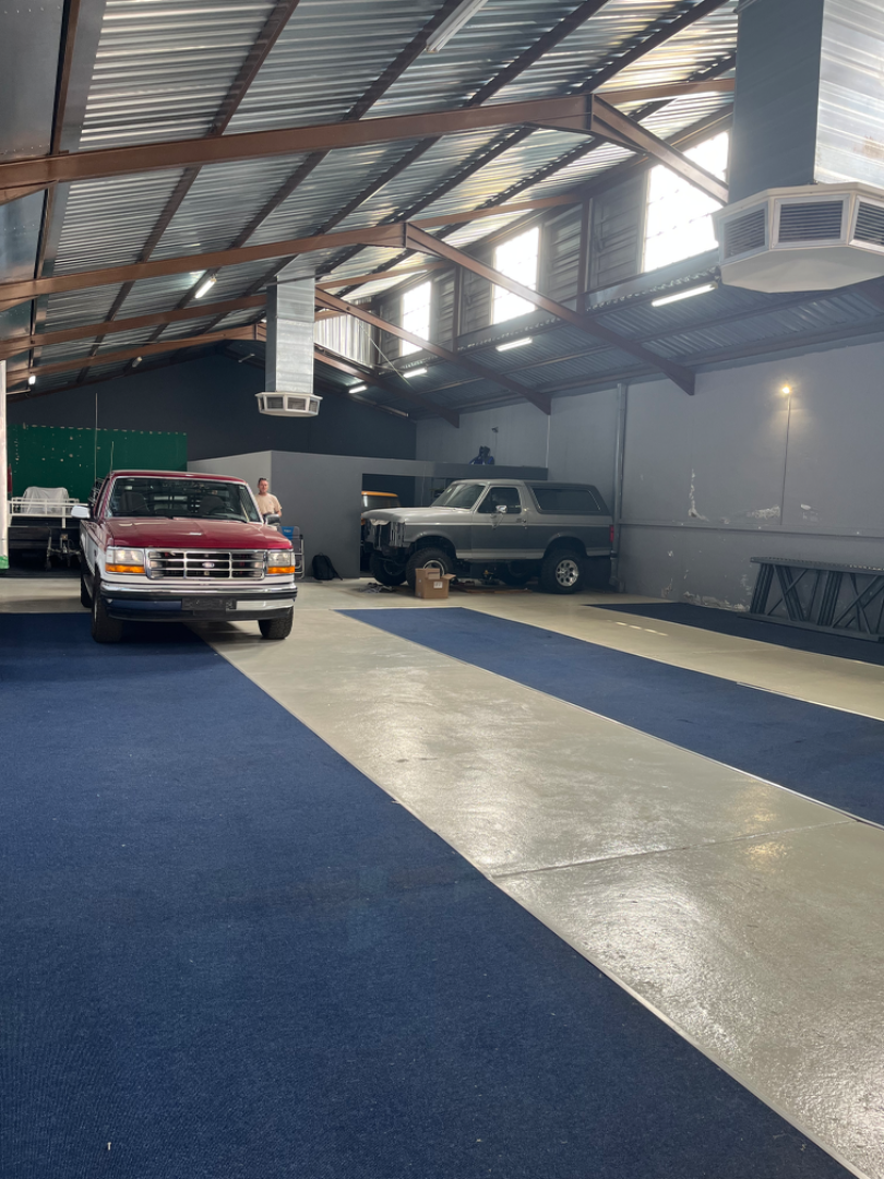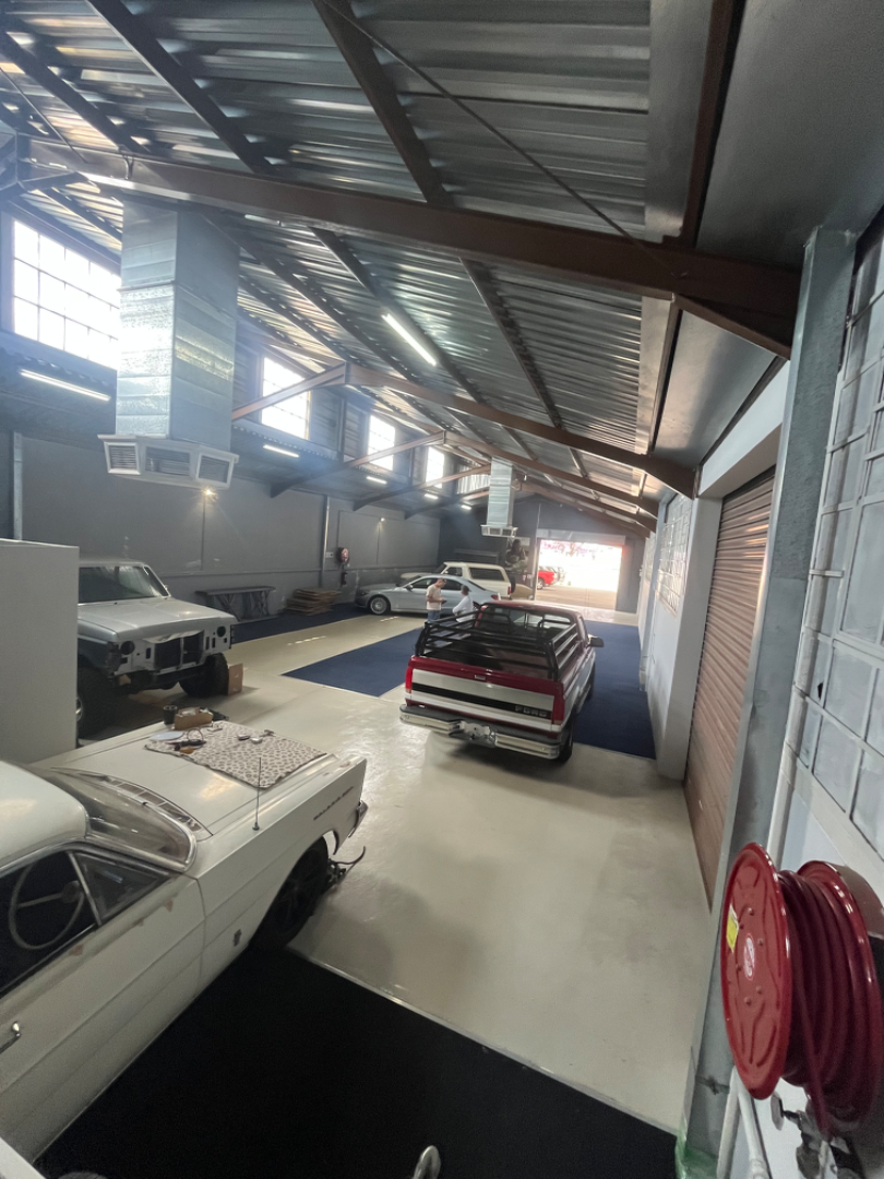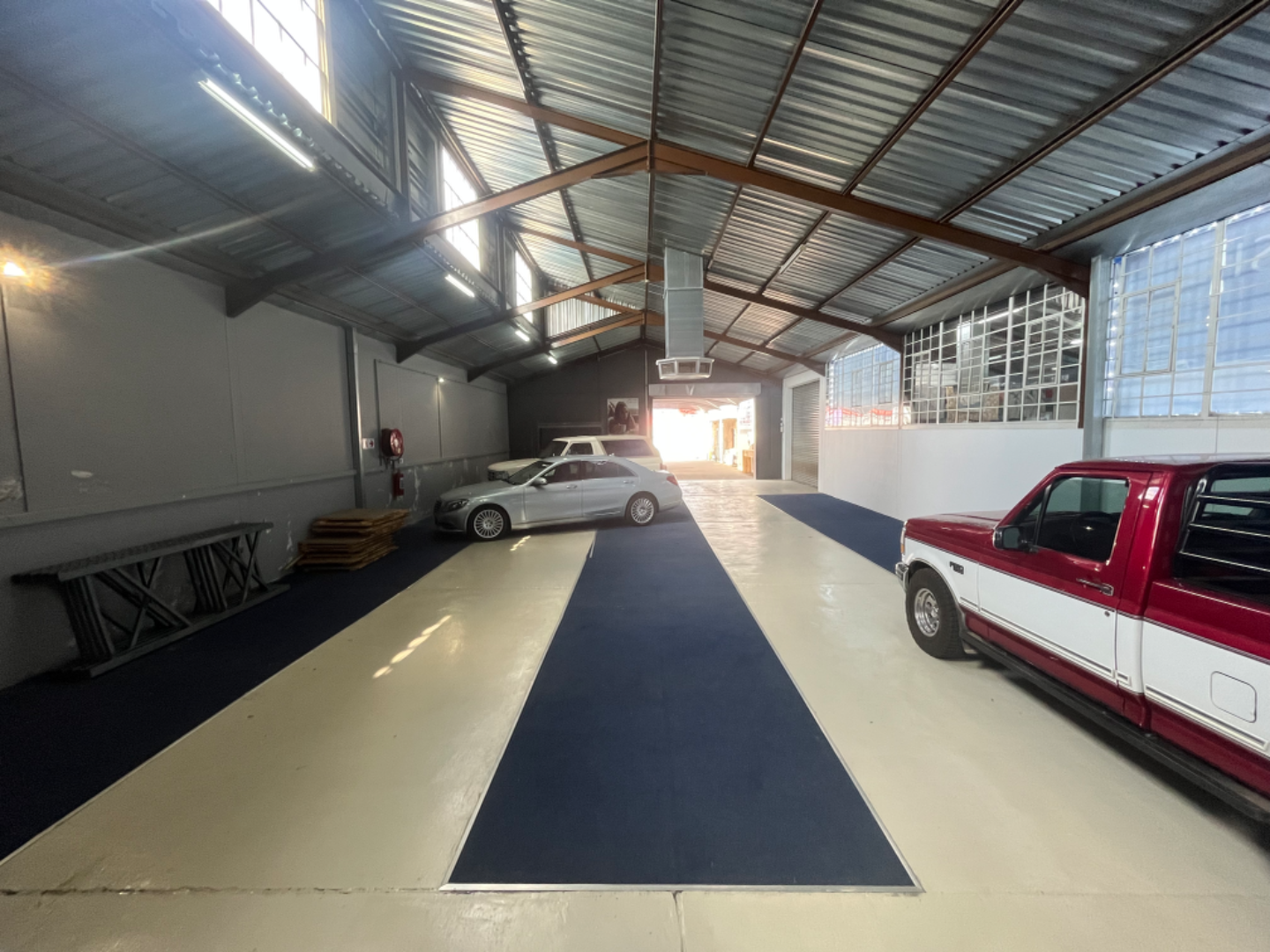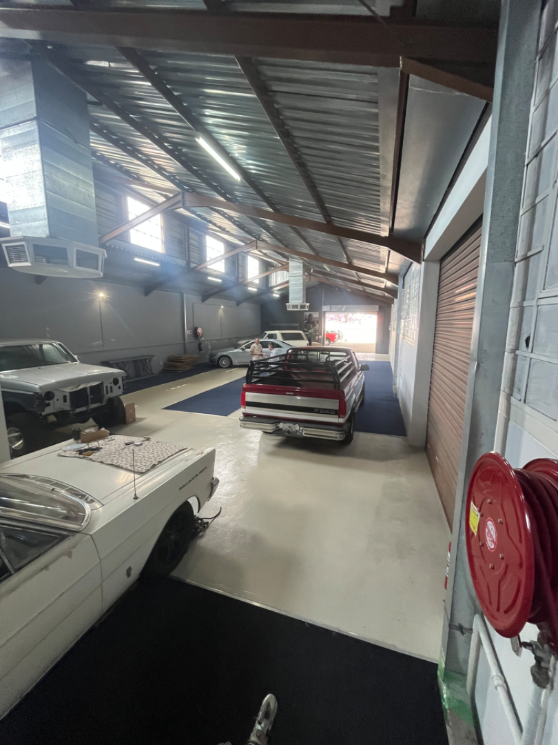 Further enhancing its utility, dedicated industrial areas offer vast, well-lit spaces with high corrugated metal roofs and exposed beams. These zones are equipped with large roll-up access doors, ideal for vehicle entry or heavy equipment, and feature polished concrete floors, some with defined pathways. Integrated ventilation systems and visible fire safety equipment ensure a safe and efficient working environment for diverse industrial applications.
